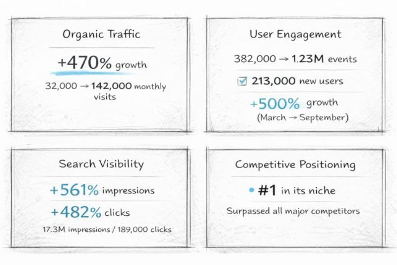 - +470% organic traffic growth (32,000 → 142,000 monthly sessions)